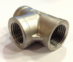 304 Stainless Steel, 1/2" Female Pipe Thread on all three openings.